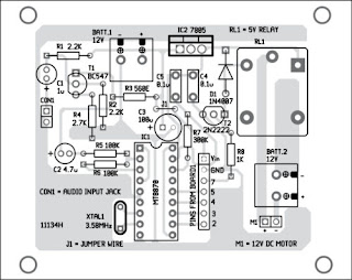 An actual-size PCB layout of the food dispenser is shown in Fig. 4 and its components layout in Fig. 5. Use a geared DC motor for rotating the lid. A 12V battery (BATT.1) is used to power the transistor amplifier stage, 7805 and Arduino board. Another 12V battery (BATT.2) is used to power the geared DC motor.